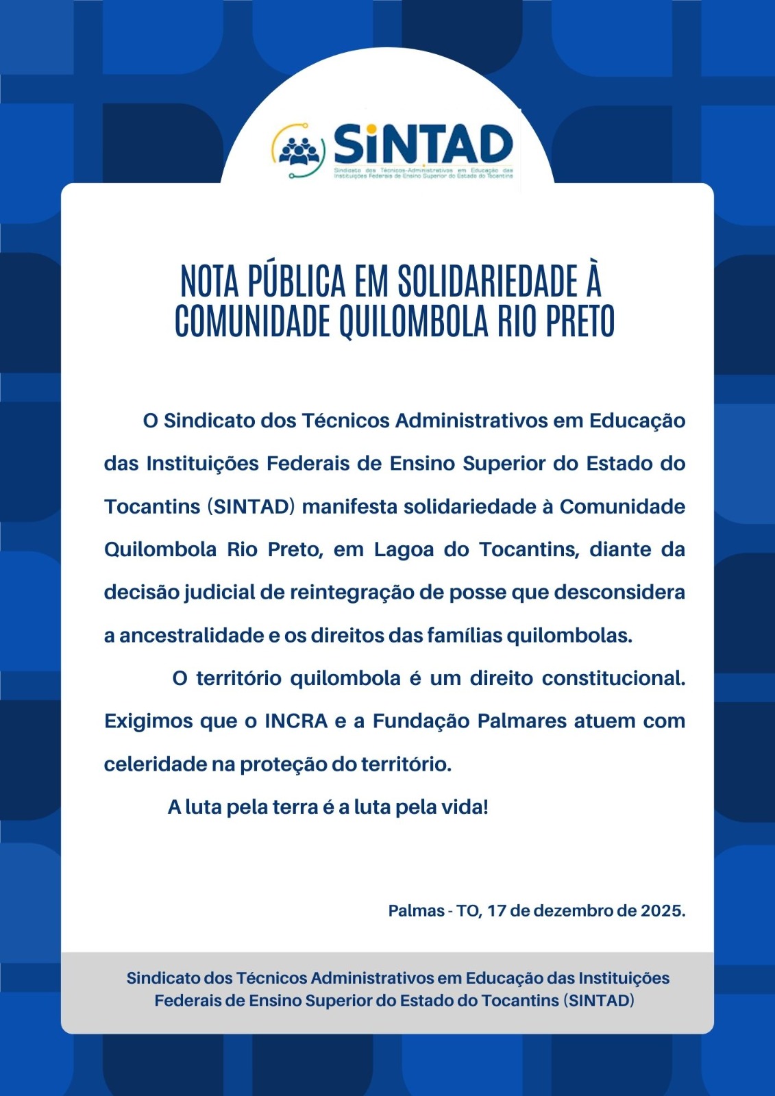 O Sindicato dos Técnicos Administrativos em Educação das Instituições Federais de Ensino Superior do Estado do Tocantins (SINTAD) publicou, nesta terça-feira (17), uma nota pública de solidariedade à Comunidade Quilombola Rio Preto, localizada no município de Lagoa do Tocantins.